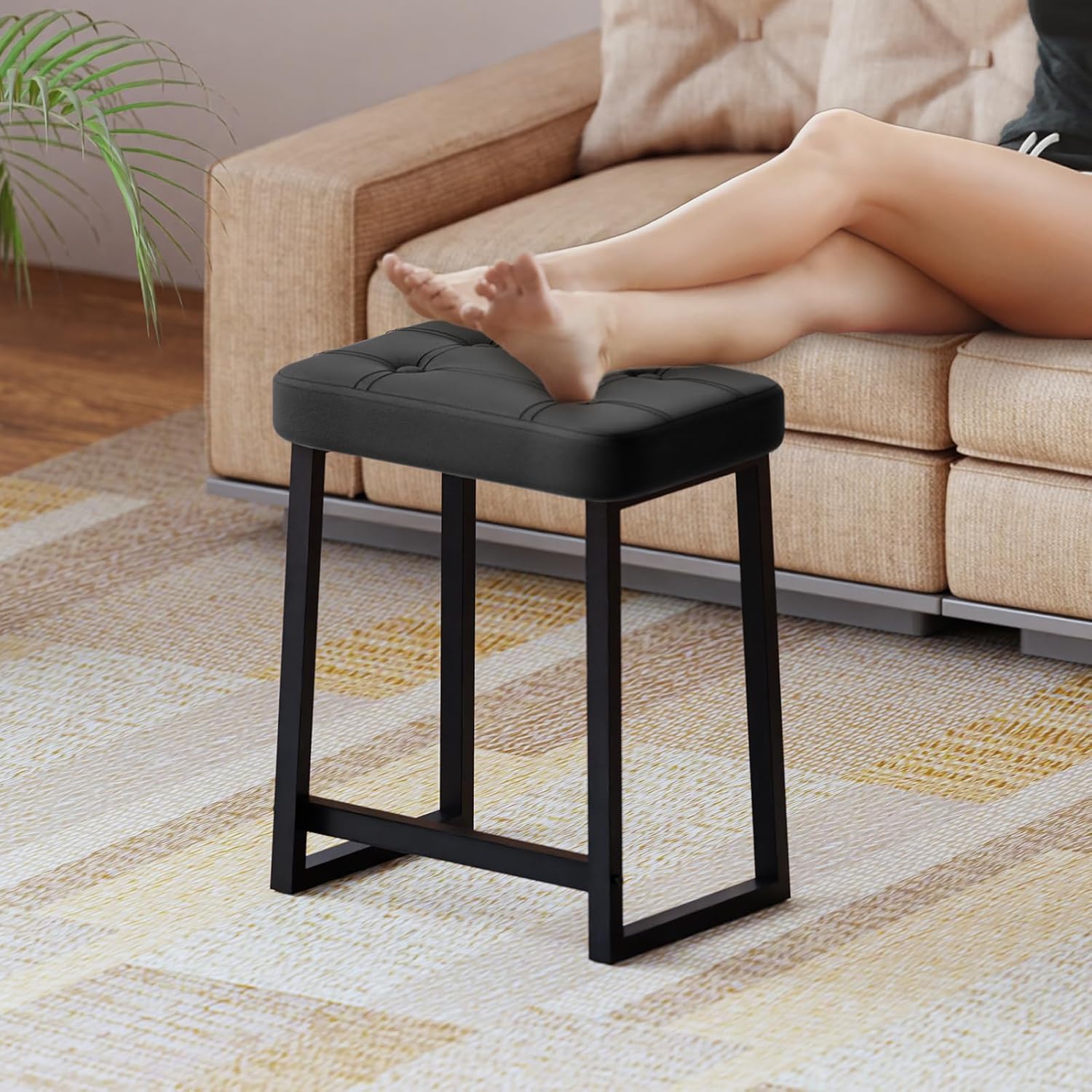 • 【Modern & Minimalist Design】Sleek black padded stool with tufted cushion and metal frame – perfect for contemporary interiors.