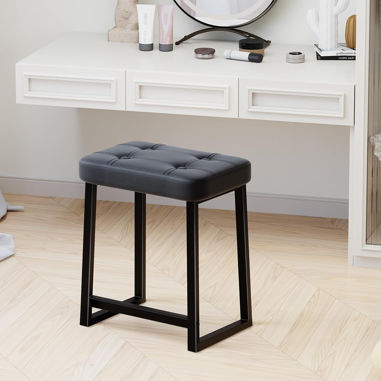 Modern Black Padded Vanity Stool – Faux Leather Tufted Cushion Seat with Metal Frame |