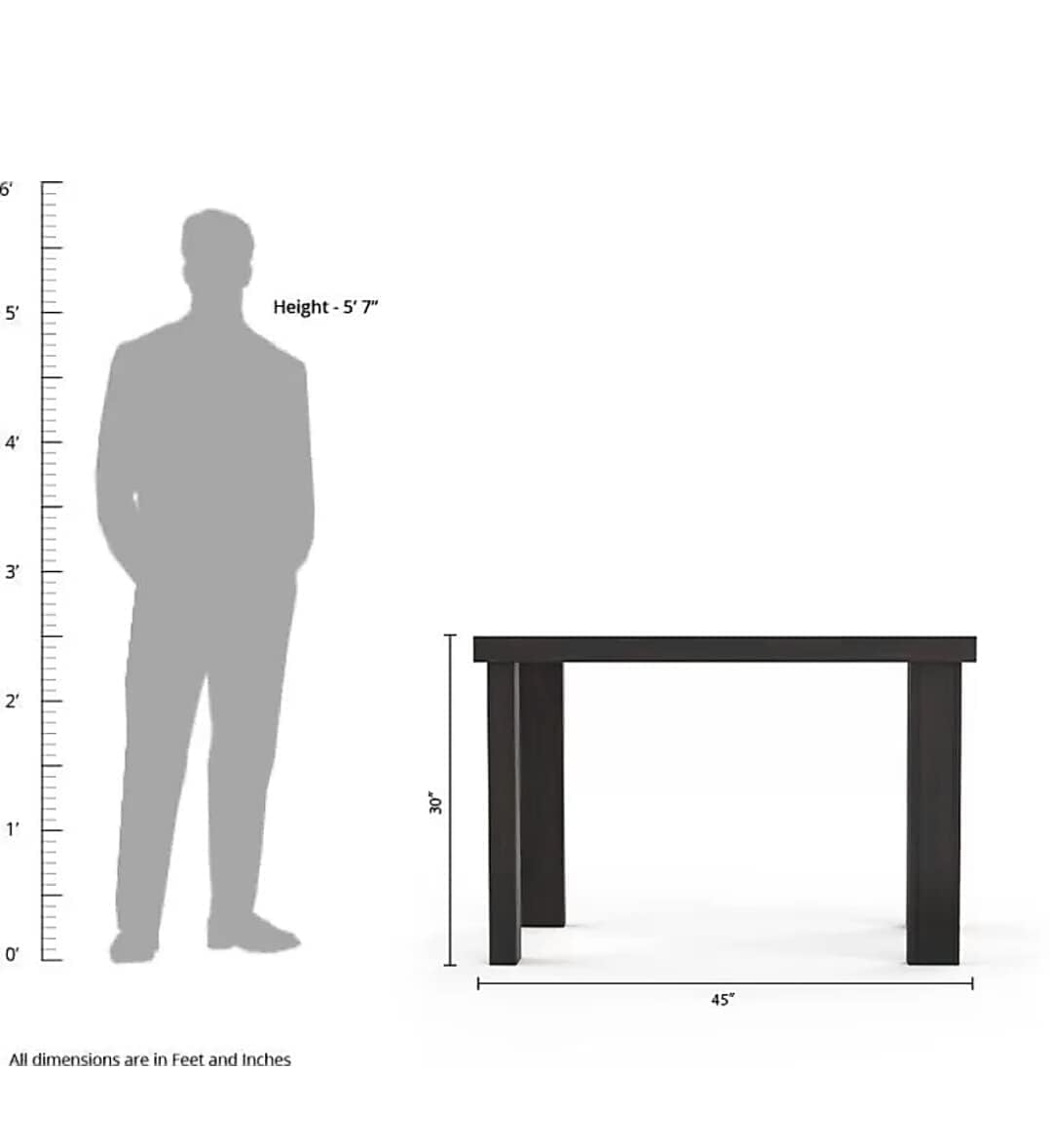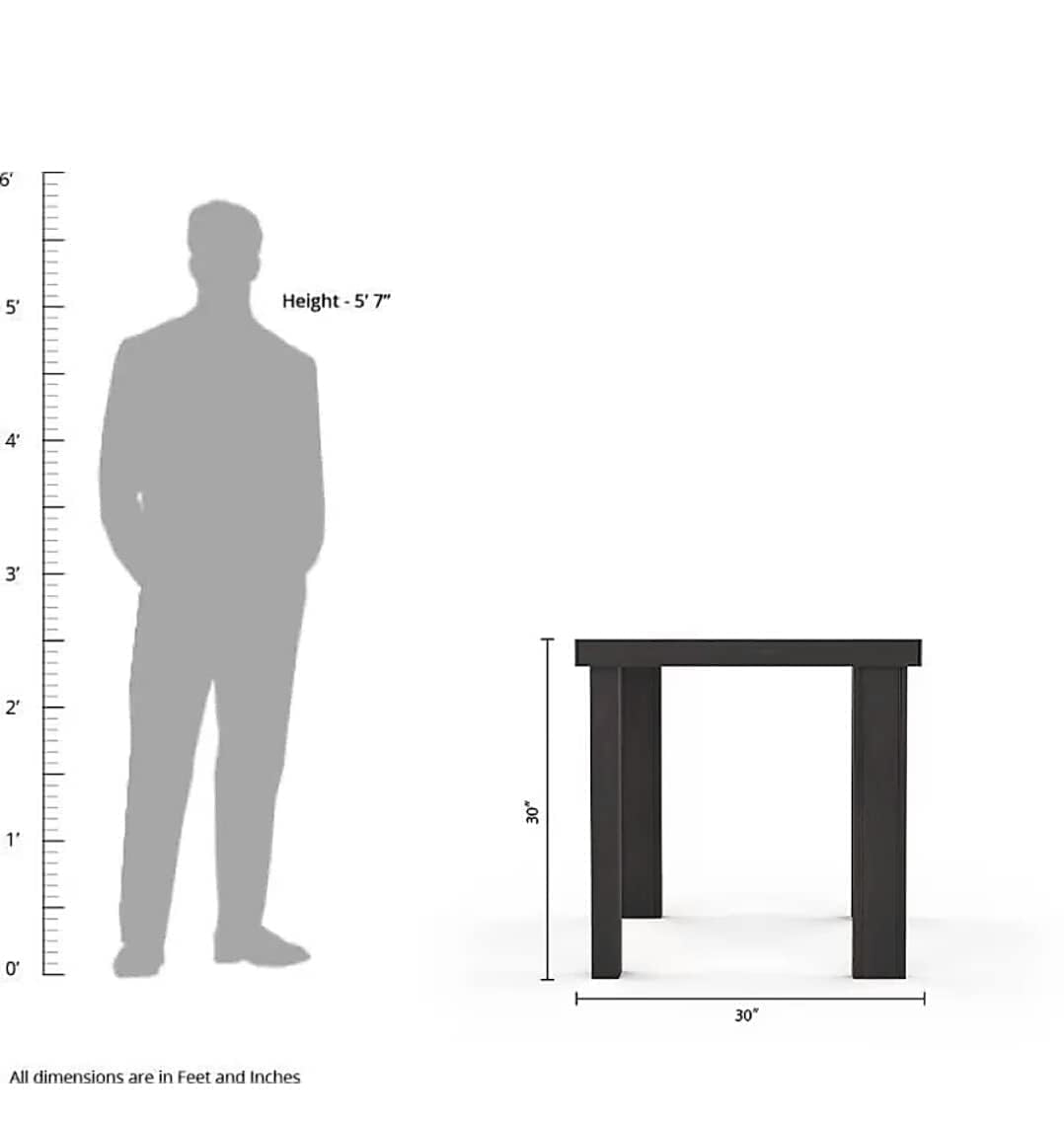 - Product Dimensions Table: Length 45 Inch x Width 30 Inch x Height 30 Inch | Chair: Length 18 Inch x Width 18 Inch x Height 34 Inch. Seating Height – 18