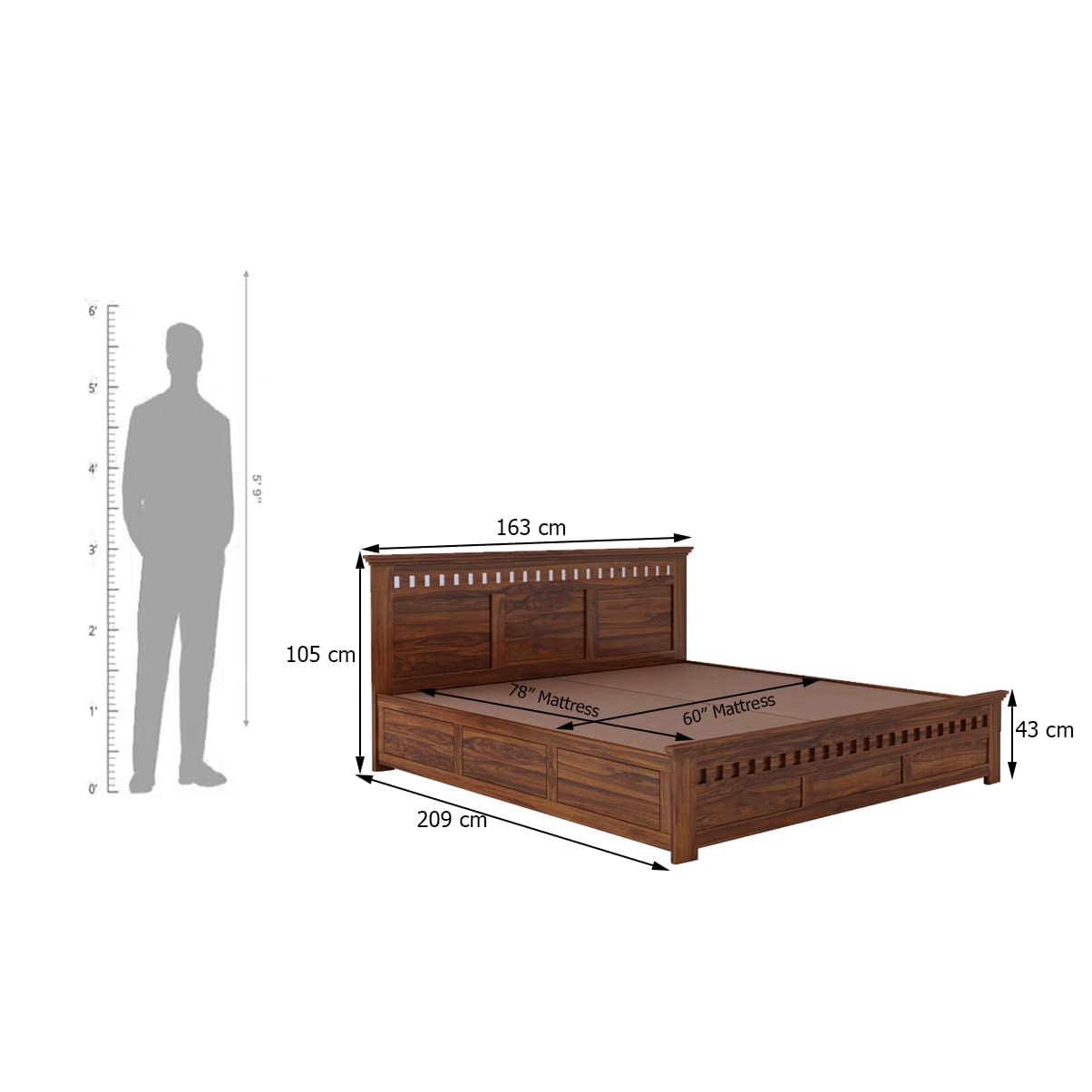 - Bed Dimension: Length (209 cm), Width (163 cm), Height (105 cm), Recommended Mattress Size: 78 X 60 inch (Mattress is not Included)